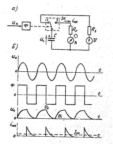 Конденсаторные частотомеры. Принцип действия конденсаторного частотомера поясняется схемой, приведенной на рис. 1,а и временными диаграммами, изображенными на рис, 1.б.