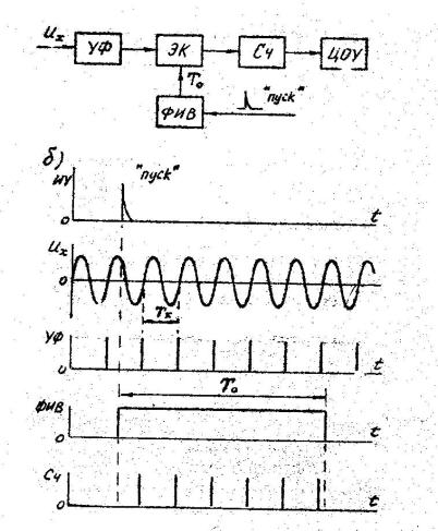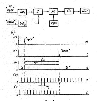 На рис. 2а приведена упрощенная схема цифрового частотомера, а на рис. 2,6 временные диаграммы в различных ее точках.