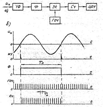 Напряжение измеряемой частоты fx подается на усилителе формирователь УФ, преобразующий различные по форме и амплитуде периодические сигналы в короткие импульсы, частота следования которых равна fx. Эти импульсы поступают на вход электронного ключа ЭК, который нормально закрыт. Управление ЭК производится сигналами схемы формирователя интервалов времени (ФИВ). Запуск ФИВ осуществляется сигналом "ПУСК". По сигналу "ПУСК" ФИВ формирует импульс прямоугольной формы длительностью Т0. Под действием импульса ЭК открывается и за время Т0 на счетчик СЧ с ФИВ поступит N импульсов.