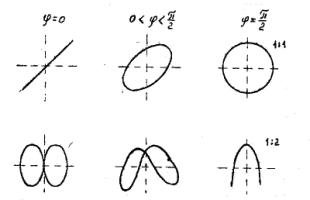 Электронный луч под действием двух взаимно перпендикулярных электрических полей, изменяющихся по гармоническому закону, будет прочерчивать на экране некоторую сложную фигуру, которую и называют фигурой Лиссажу. Форма этой фигуры зависит от соотношения частот сигналов и их начальных фаз. Если соотношение частот сигналов выражается отношением целых чисел, то результирующая фигура представляется в виде неподвижного изображения. Например, для двух синусоидальных сигналов, совпадающих по фазе и частоте, фигура Лиссажу изображается прямой линией, располагаемой под некоторым углом к горизонтальной оси. На рис. 6 приведены фигуры Лиссажу для некоторых соотношений частот и фаз.