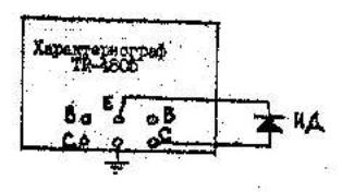 3. Измерение вольтамперных характеристик неуправляемых полупроводниковых приборов выполняют по схеме, изображенной на рис.14. Исследуемый диод подключают к гнездам Си Е, а органы управления ТR4805 устанавливают в положения, соответствующие получении на экране ЭЛТ изображения вольтамперной характеристики. Для наблюдения прямой или обратной ветвей диода используют переключатель COLLECTOR SUPPLY ±AC. Тип исследуемого диода указывает преподаватель.