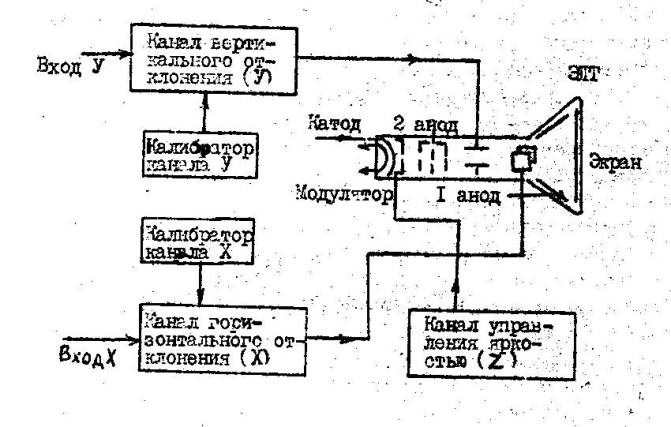 Устройство электронного осциллографа показано на рис.1. В состав осциллографа входят: электронно-лучевая трубка ЭЛТ, канал вертикального отклонения луча (канал У) и его калибратор, канал горизонтального отклонения луча (канал X) и его калибратор, канал управления яркостью (канал Z ). ЭЛТ содержит подогреваемый катод, модулятор тока луча., фокусирующий анод I, ускоряющий анод 2, вертикальные отклоняющие пластины У, горизонтальные отклоняющие пластины Х и люминофорный экран, помещенные внутри стеклянной колбы.