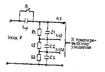 Структурная схема канала вертикального отклонения приведена на рис.2. Входная цепь канала У служит для согласования параметров усилителя вертикального отклонения с параметрами цепи исследуемого сигнала. Основными функциями входной цепи являются; пропускание на вход усилителя сигнала с постоянной составляющей (открытый вход) или без нее (закрытый вход), изменение чувствительности канала У путем деления напряжения входного сигнала. Устройство входной цепи приведено на рис.3. С помощью разделительного конденсатора Ср производится отделение постоянной составляющей входного сигнала (создание закрытого входа). При закорачивании этого конденсатора постоянная составляющая входного сигнала проходит на вход усилителя. Изменение чувствительности канала У осуществляется при помощи делителя на сопротивлениях R1,......,R3. Для коррекции частотной характеристики делителя в области высоких частот используются конденсаторы C1,.......,C3.