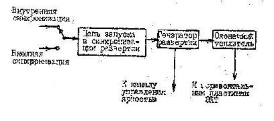 Структурная схема канала горизонтального отклонения приведена на рис.4. Канал горизонтального отклонения состоит из генератора развертки с оконечным усилителем, цепей запуска и синхронизации развертки.