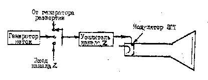 Сигнал, модулирующий яркость изображения, подается на модулятор ЭЛТ через усилитель канала Z . Вход усилителя канала Z подключается к генератору развертки (для гашения обратного хода развертки), к генератору меток (для создания яркостных меток на изображении) или к внешнему источнику сигнала (для подсветки изображения).