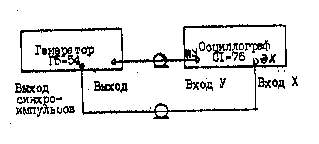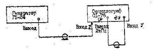 3. При выполнении п.З программы определяют погрешность частоты и длительности импульсов калибратора. Измерения проводят по схеме, изображенной на рис.15. Выход генератора Г5-54 подключают к входу Z осциллографа С1-75, расположенному на задней панели прибора. Устанавливают частоту генератора, равную 20 кГц, выходное напряжение - 10 В и длительность импульсов 40 мкс