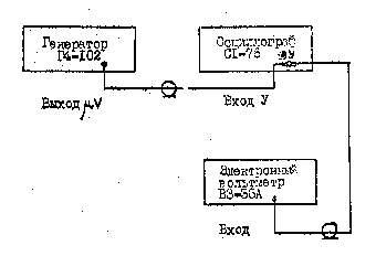 Установить на выходе генератора Г4-102 частоту, указанную в ф.6, и напряжение 0,1 В. Вращая ручку уровня синхронизации, добиваются устойчивого изображения выходного сигнала генератора на экране осциллографа. Затем уменьшают напряжение на выходе генератора и добивается срыва синхронизации изображения. Напряжение, при котором происходит срыв синхронизации из обращения заносят в ф.6.