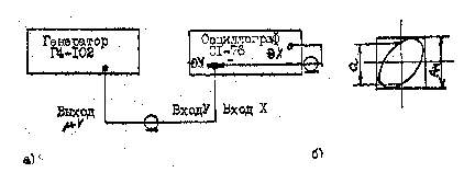 2.2. Определение разности фаз между каналами вертикального и горизонтального отклонения выполняют по схеме, изображенной на рис.13.а. Выходной сигнал генератора Г4-102 подводится к входам Х и Y электронного осциллографа, работающего с выключенным генератором развертки, а разность фаз измеряют с помощью фигуры Лиссажу, получаемой на экране осциллографа. Фазовый сдвиг для фигуры Лис сажу в виде эллипса (рис.13,б) рассчитывают по формуле