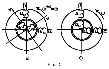 Проекции векторов на оси координат можно рассматривать как величины, соответствующие обмоткам, расположенным на взаимно-перпендикулярных осях. В этом случае уравнения (1) будут соответствовать двухфазной электрической машине с одной парой полюсов, модель которой показана на рис. 2. Такая электрическая машина называется обобщённой (ОЭМ).