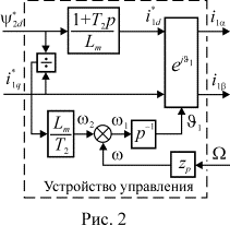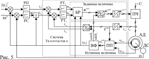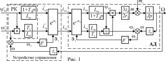 Следует отметить, что УУ рис. 1 и 2 может выполнять свои функции только при условии, что параметры АД, входящие в передаточные функции его звеньев соответствуют истинным значениям, в противном случае потокосцепление и частота ротора в АД и в устройстве управления будут отличаться друг от друга. Это обстоятельство создает значительные трудности при реализации систем векторного управления на практике, т.к. параметры АД изменяются в процессе работы. В особенности это относится к значениям активных сопротивлений.