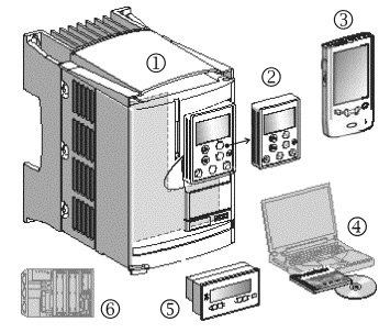 Типичная комплектация ПЧ показана на рисунке. Она включает собственно преобразователь (1); диалоговый терминал (2), который может устанавливаться на преобразователе или отдельно на крышке шкафа, а также на удалении в несколько метров, соединяясь с преобразователем телефонным кабелем; комплект Power Suite для миникомпьютера (3); программное обеспечение Power Suite для ПК (4); операторскую панель (5); различные карты расширения (6). Набор карт расширения позволяет индивидуализировать применение ПЧ. Это могут быть: карты входов-выходов, позволяющие увеличить их число и адаптировать к имеющемуся оборудованию; коммуникационные карты, позволяющие организовать обмен информацией процессора ПЧ с внешними устройствами, имеющими другими шины и протоколы; а также прикладные карты, в основном предназначенные для раздельного управления приводами в многодвигательном приводе.
