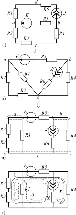 Количество контуров, которые могут быть образованы для определенной электрической цепи, ограничено и определено. Так для цепи рис г) число возможных контуров равно шести.