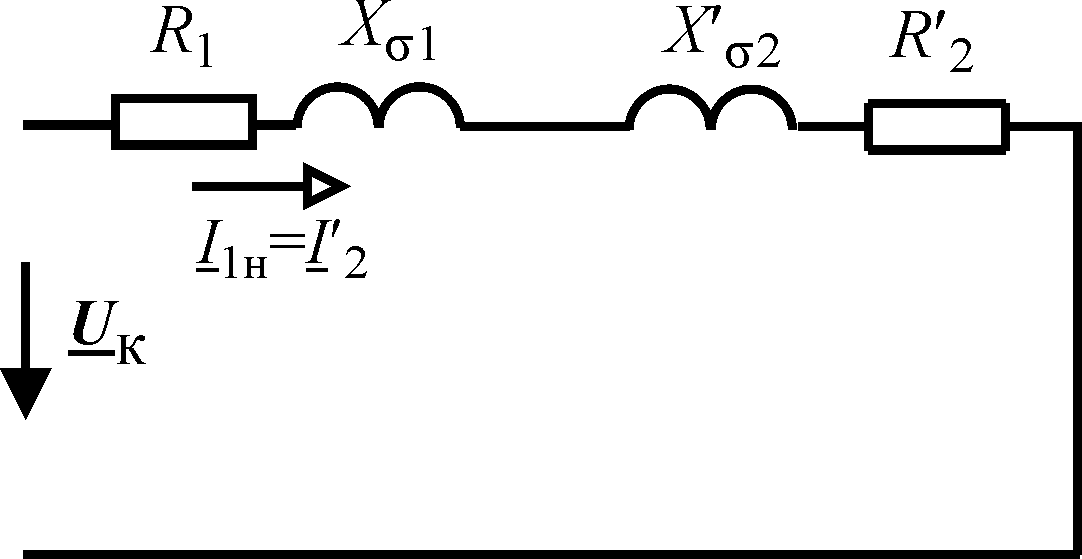 составляет 5-10% от номинального, поэтому и основной магнитный поток в сердечнике трансформатора в несколько раз меньше номинального. При столь низком магнитном потоке тепловые потери в сердечнике пренебрежимо малы и практически вся активная мощность, потребляемая трансформатором в режиме короткого замыкания расходуется на нагрев обмоток. Упрощенная схема замещения режима короткого замыкания приведена на рисунке.
